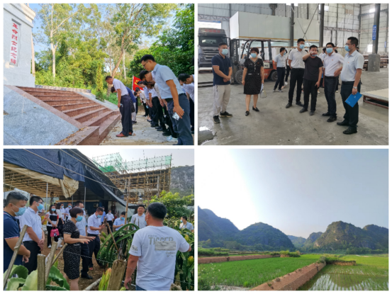 活动中,局党员干部来到金鸡革命烈士纪念碑前,向革命先烈鞠躬致敬,共同缅怀先烈抛头颅洒热血的革命斗争史,传承红色基因,筑牢信仰之基。一行人还前往罗定市金丰实业有限公司、金鸡镇石龙村火龙果种植基地、垦造水田项目等开展实地调研,了解金丰公司企业文化、项目建设情况、技术优势、社会效益、发展存在瓶颈问题等方面情况;深入了解火龙果种植基地项目建设情况、项目种植培育品种、产品销售、“公司+基地+农户+配送”合作模式等方面情况;通过金鸡镇庙岗等三个村的垦造水田项目——金鸡镇水龙村辣椒、丝苗米乡村振兴产业示范基地,了解金鸡镇在垦造水田工作上的亮点、经验及成效等情况。