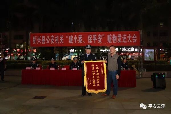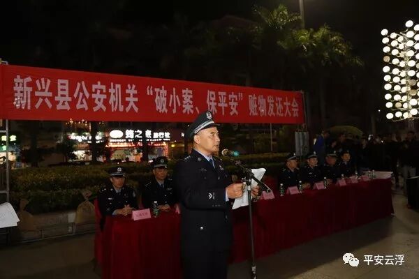 12月25日晚,新兴文化广场,灯火通明,人声鼎沸。20时30分,新兴县公安机关“破小案、保平安”赃物发还大会在这里举行。