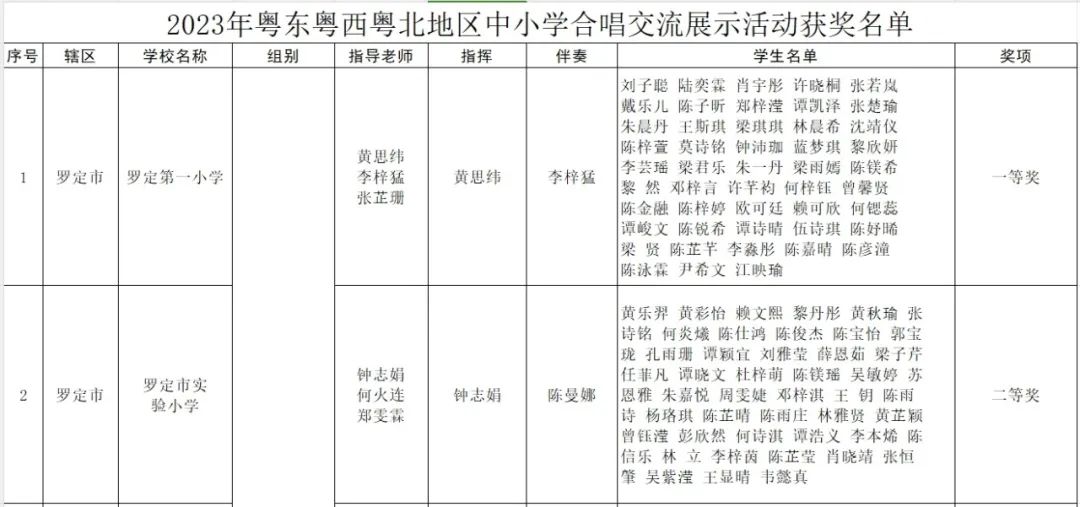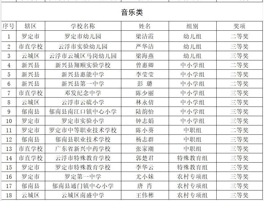 在粤东粤西粤北地区中小学合唱交流展示活动中,我市参加小学组、初中组和高中组的比赛,获得一等奖2个、二等奖3个、三等奖13个。云浮市教育局获优秀组织奖。获奖的学校分别是: