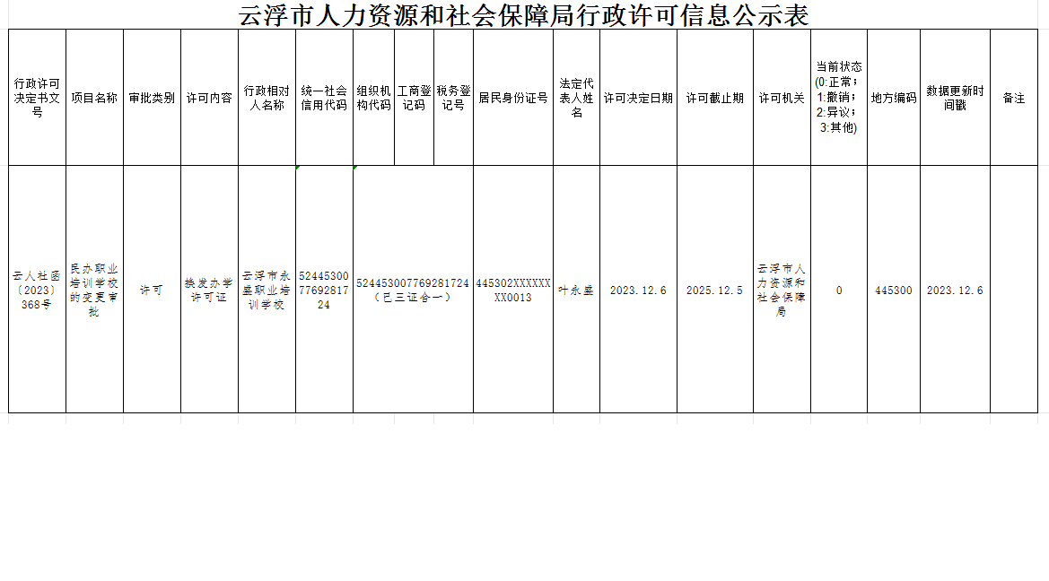 云浮市永盛职业培训学校申请民办职业培训学校的变更审批