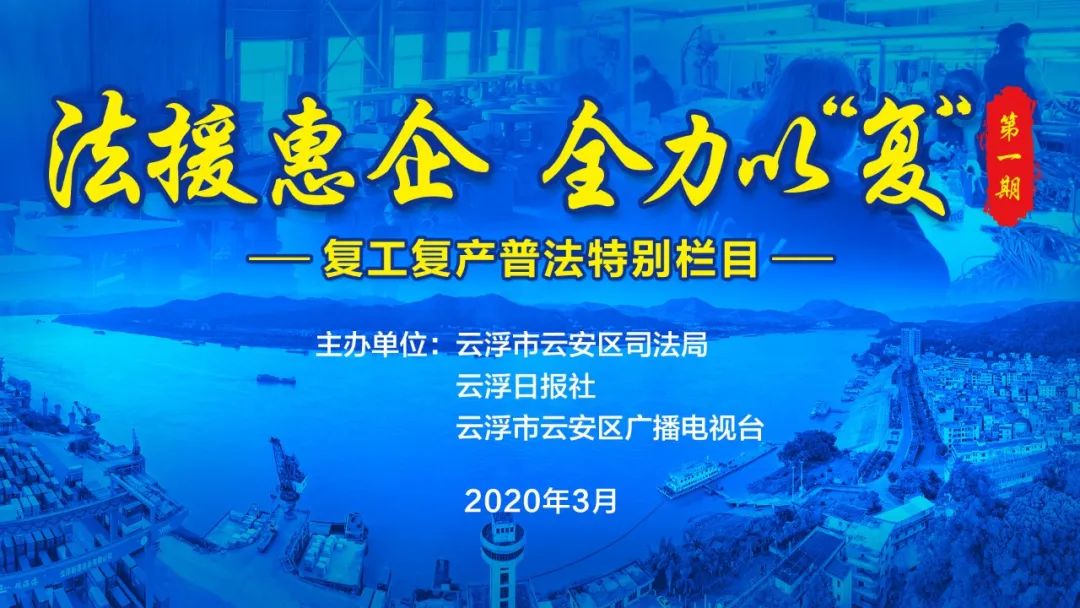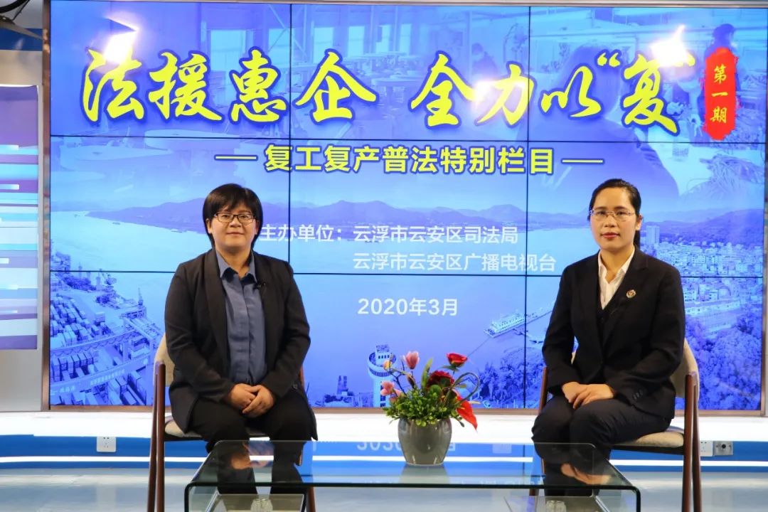 2020年3月6日,在新冠肺炎疫情防控处在最吃劲的关键阶段,云安区司法局联合云浮日报社、云安区广播电视台开办《法援惠企 全力以“复”》普法栏目,全面落实中央、省、市、区关于疫情防控的决策部署,支持帮助企业共渡难关,全力保障企业依法有序复工复产。