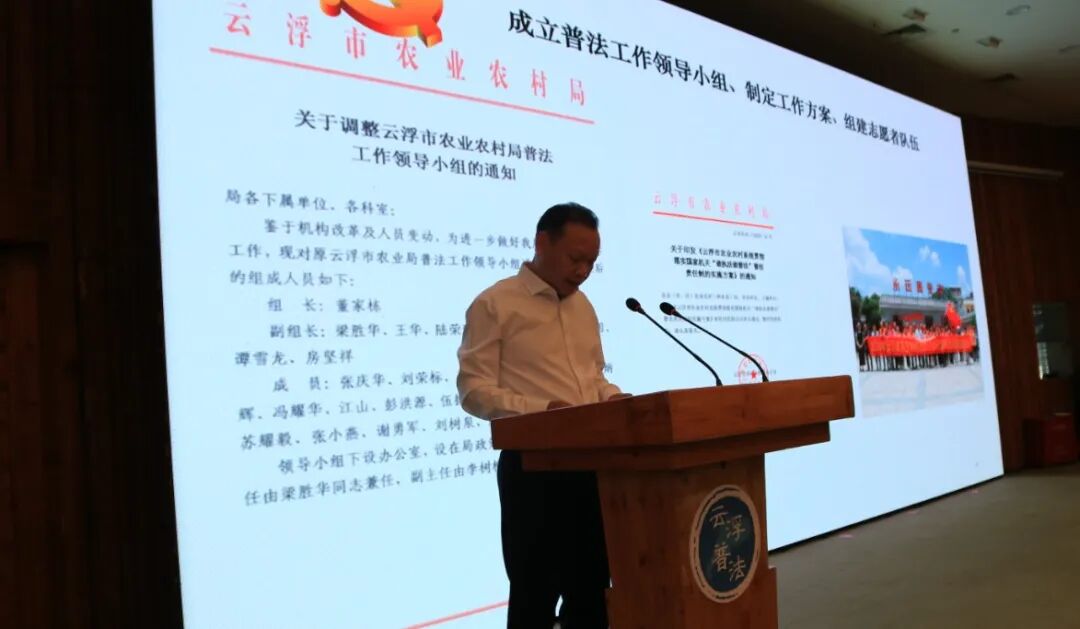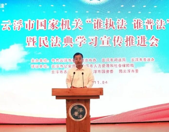 黄天生强调,要深入贯彻落实习近平总书记全面依法治国新理念新思想新战略,扎实开展法治宣传教育,各地各部门要把法治宣传教育融入科学立法、严格执法、公正司法、全民守法的全过程、各环节,推动形成党委领导、人大监督、政府实施、部门分工负责、全社会共同参与的“大普法”格局,进一步推动各级领导干部带头学法用法,要带头宣传、推进、保障民法典实施,将民法典学习宣传列入“八五”普法规划,积极开展各类普法宣传活动,打造云浮法治文化建设品牌,在全市营造浓厚的法治文化氛围,努力建设更高水平的平安云浮、法治云浮,为我市聚力打造粤北生态建设发展新高地、推动乡村振兴走在全省前列,推动经济社会高质量发展作出新的积极贡献。