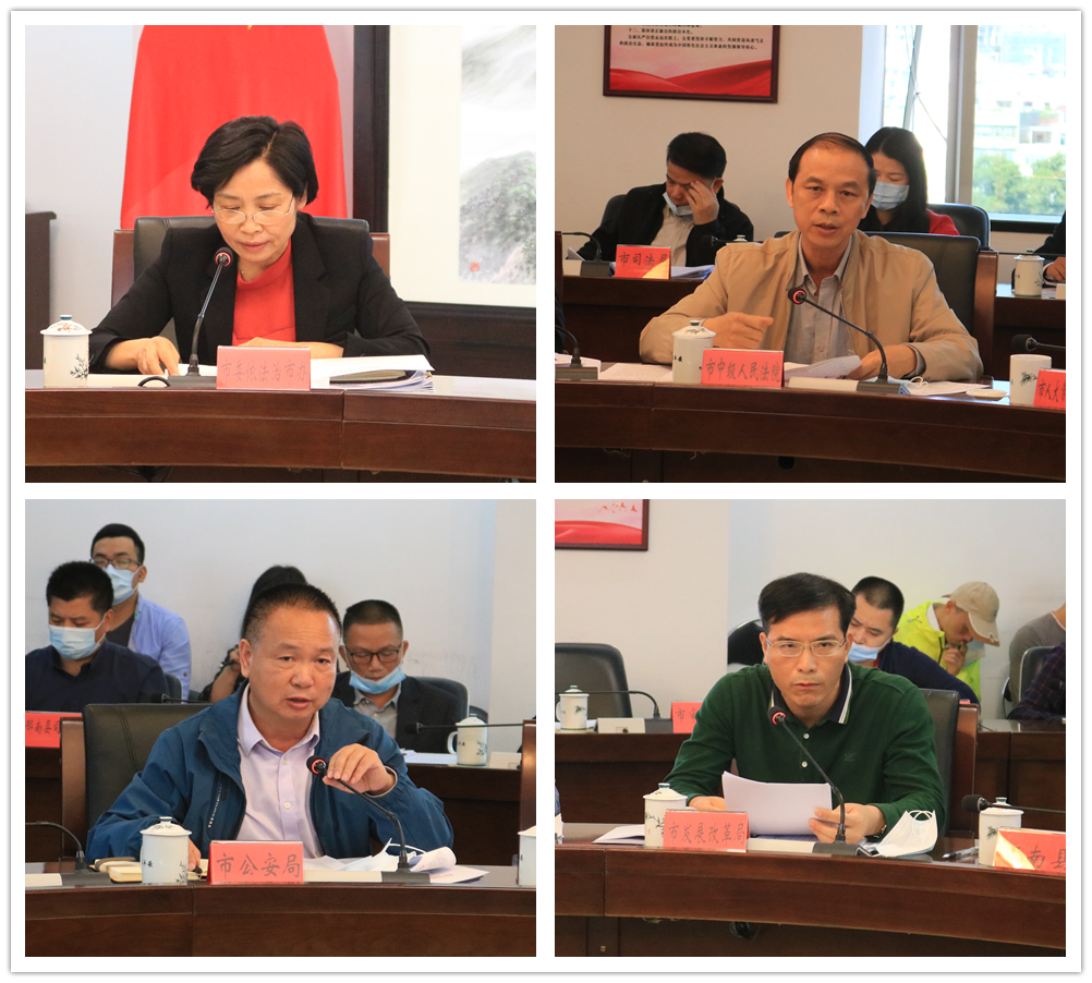 会上,市委依法治市办副主任、市司法局局长莫慧玲传达学习了《广东省落实中央依法治国办党政主要负责人履行推进法治建设第一责任人职责情况列入年终述职内容试点工作实施方案》,并通报了我市2019年度法治广东建设考评反馈情况,市法院、市公安局、市发展改革局分别就法治广东建设考评整改落实作了发言。