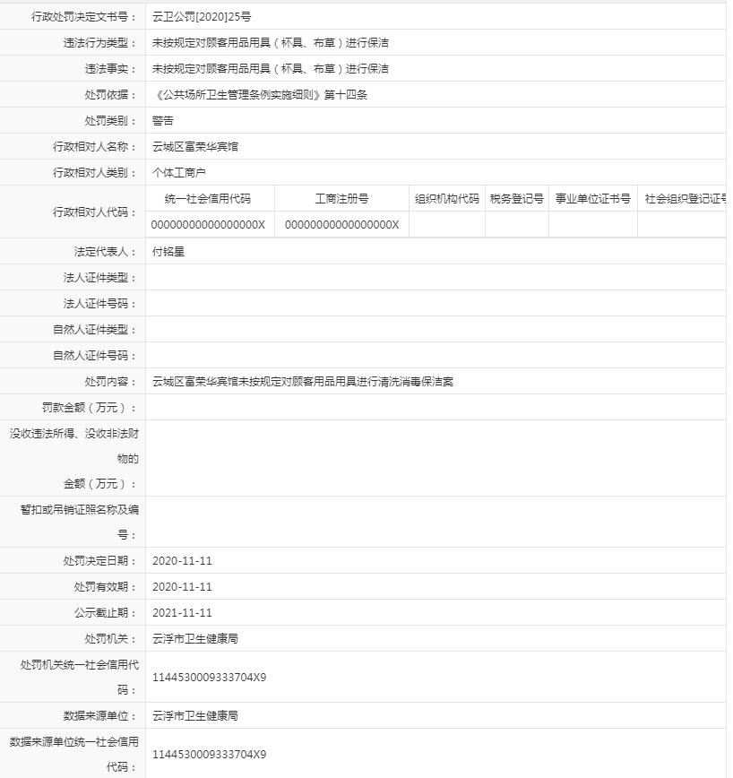 云浮市卫生健康局2024年11月20日行政处罚明细表