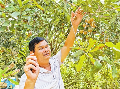在云城区南盛镇横岗村的云浮市利农坚果有限公司基地里,一串串青绿色的澳洲坚果簇拥枝头(如图),公司负责人周志文介绍,在“公司+基地+农户”模式的带动下,不仅自有的130亩基地丰产,还辐射带动周边210多户农户种植1000多亩坚果。