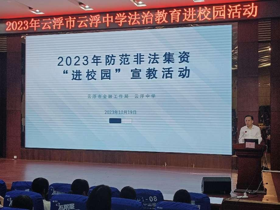 为深入实施“八五”普法规划和《青少年法治教育大纲》,落实国家机关“谁执法谁普法”普法责任制,增强青少年识别防范非法集资的能力,建设平安和谐的法治校园。云浮市处非办、云浮市金融工作局结合学习贯彻习近平新时代中国特色社会主义思想主题教育,持续开展普法宣传教育,10月19日,云浮市金融工作局在云浮中学开展以“守住钱袋子 护好幸福家”主题的防范非法集资宣传教育进校园活动。