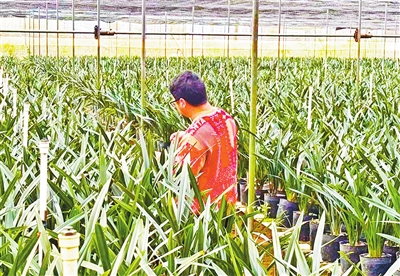 近日,笔者在位于泗纶镇的罗定市荣山农业科技有限公司兰花种植基地看到,温室大棚内一盆盆墨兰长势良好,叶片青翠挺拔,部分花株已挂有花苞,工人正有序进行管护作业,为春节前集中上市做好准备。“我们基地主要种植的是墨兰,也叫贺岁兰,目前种植面积大概有50亩,培育规模保持在13万盆左右,这一批兰花已经进入预订阶段,预计春节前可分批供应市场。”罗定市荣山农业科技有限公司总经理梁永健介绍。