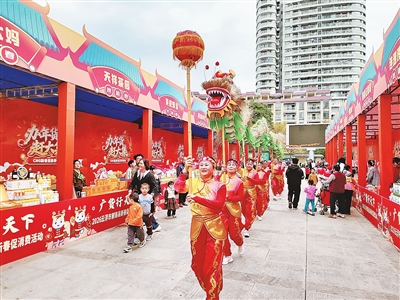 当日上午10时,为期6天的“广货行天下 来‘郁’过大年”2026郁南县“办年货 赶大集”文旅促消费活动在九星湖广场盛大开集。锣鼓喧天中,醒狮腾跃、禾楼舞翩跹、茅龙舞翻飞,传统非遗与年轻街舞创新融合的“禾楼街舞”更添青春活力。年货展销区里,腊肉腊肠飘香四溢,无核黄皮果汁、饼干等特色美食引得市民驻足购买,椰茸酥、黄皮鸡仔饼、黄皮蜜饯等饼类摊位前试吃的市民络绎不绝。